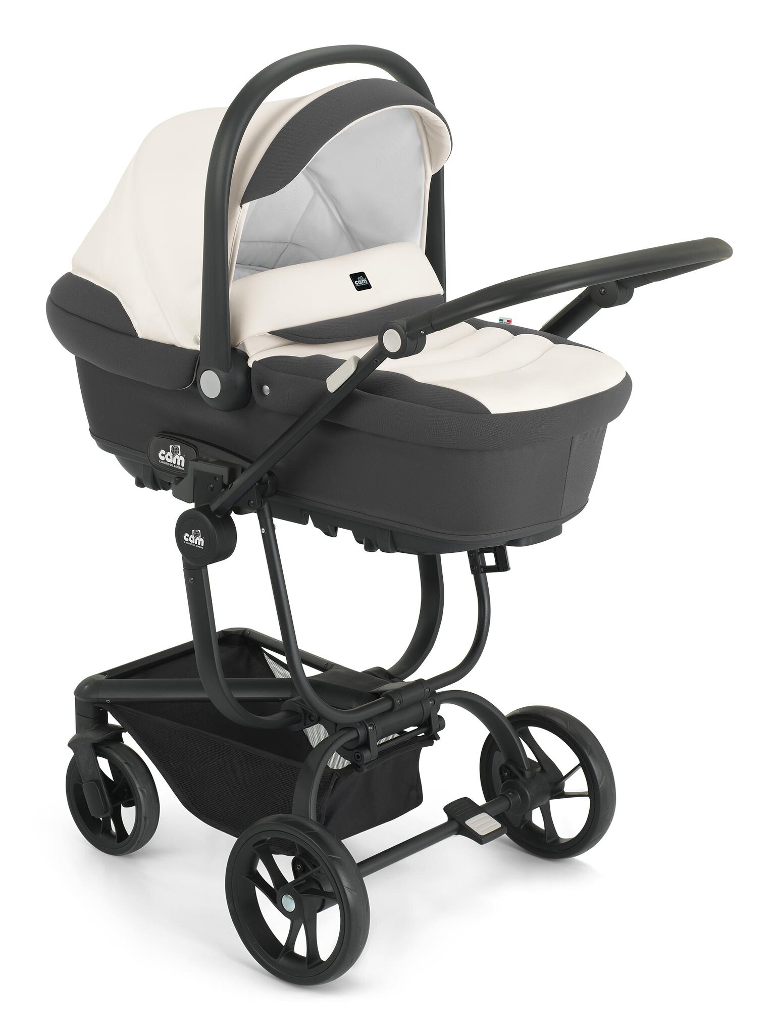Коляска 3 в 1 Cam Taski - эксклюзивная новинка от итальянской компании, полный модульный набор 3 в 1 на алюминиевом шасси необычной изысканной формы, включает в себя также люльку для новорожденного, прогулочный блок и автокресло группы 0+. При его создании учтены все потребности ребёнка, начиная с самого рождения и до возраста 3-4 лет, так, что покупка этого комплекта заранее решит проблему подбора транспортных средств для малыша на несколько лет вперёд. Всепогодная вместительная люлька для младенца подойдёт для прогулок в любое время года и при любой погоде, прогулочный блок с большим капюшоном и демисезонной накидкой на ножки - для ребёнка постарше, а удобное, выполненное по всем европейским стандартам надёжности автокресло вместе с шасси, сложенным компактной книжкой, можно безопасно перемещать в автомобиле вместе с маленьким пассажиром. На месте шасси раскладывается, на него устанавливается автолюлька и, пожалуйста, ещё одно полноценное транспортное средства для ребёнка готово. Также в комплект входит сумка для мамы, а сам набор выполнен в практичных или ярких цветах на выбор, и будет неизменно привлекать взгляды на улице, благодаря своему футуристическому дизайну.
